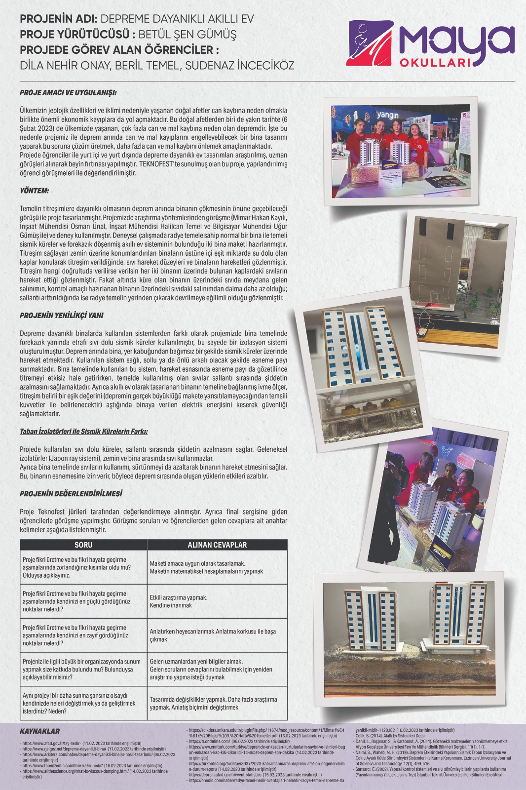 Bu proje ile deprem anında can ve mal kayıplarını engelleyebilecek bir bina tasarımı yapmak amaçlanmıştır. Depremin hangi doğrultuda etki edeceği tahmin edilemediği için tasarımların buna uygun yapılması çok önemlidir. Bu projede öğrenciler ile yurt içi ve yurt dışında depreme dayanıklı ev tasarımları araştırılmış, uzman görüşleri alınarak beyin fırtınası yapılmıştır. Yapılan tasarımda etrafı sıvı dolu küreler ve fore kazık ile binanın temeli depreme dayanıklı hale getirilmiştir. Bununla birlikte güvenliğin sağlanması için deprem anında elektrik gibi sistemlerin kapatılmasını sağlayan akıllı ev sistemi yapılmıştır. Teknofest’te sunulmuş olan bu proje, yapılandırılmış öğrenci görüşmeleri ile değerlendirilmiştir.